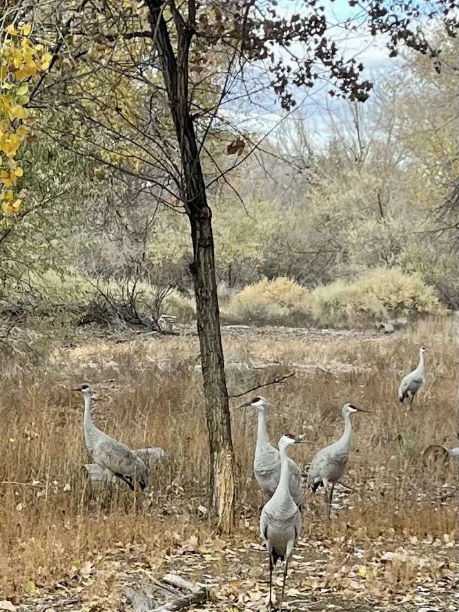 Other than the trip with Beth to Cerro Chato, this was the first time I actually called a realtor to go inside for a proper viewing. What I found was a beautiful, gracious house that did indeed have the Candelaria Nature Preserve for its back yard. Merely open the back door and you’re on the Preserve, where coyotes, cranes, porcupines, and sometimes bobcats and other creatures roam freely. The Nature Preserve belongs to the City of Albuquerque and is kept as a refuge for migratory birds and other creatures. I’m sitting, looking out at it now as I write and as flocks of sandhill cranes come and go across the meadow. And I’m wondering how I got so lucky as to find it. And again, I have a strong sense that the place found me, more than the reverse. The Rio Grande flows past, a beautiful five-minute walk from the house.